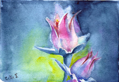 The gorgeous photographic image was a delight to work from. I did many washes of blue to get the nocturnal feeling and to keep the middle area light I sprayed out the color with a spray bottle. To regain some of the whites I went over the petals with white watercolor pencil.